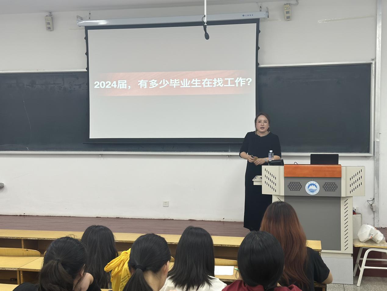 9月11日下午,外国语二 人 麻将 在何世礼教学馆206举办了大学生升学就业趋势专题报告会,沈阳新东方国际教育副总经理李松洋受邀主讲。二 人 麻将 党委副书记、副院长(兼)严志刚、学生工作办公室相关负责老师及2023级全体本科生参加本次报告会。