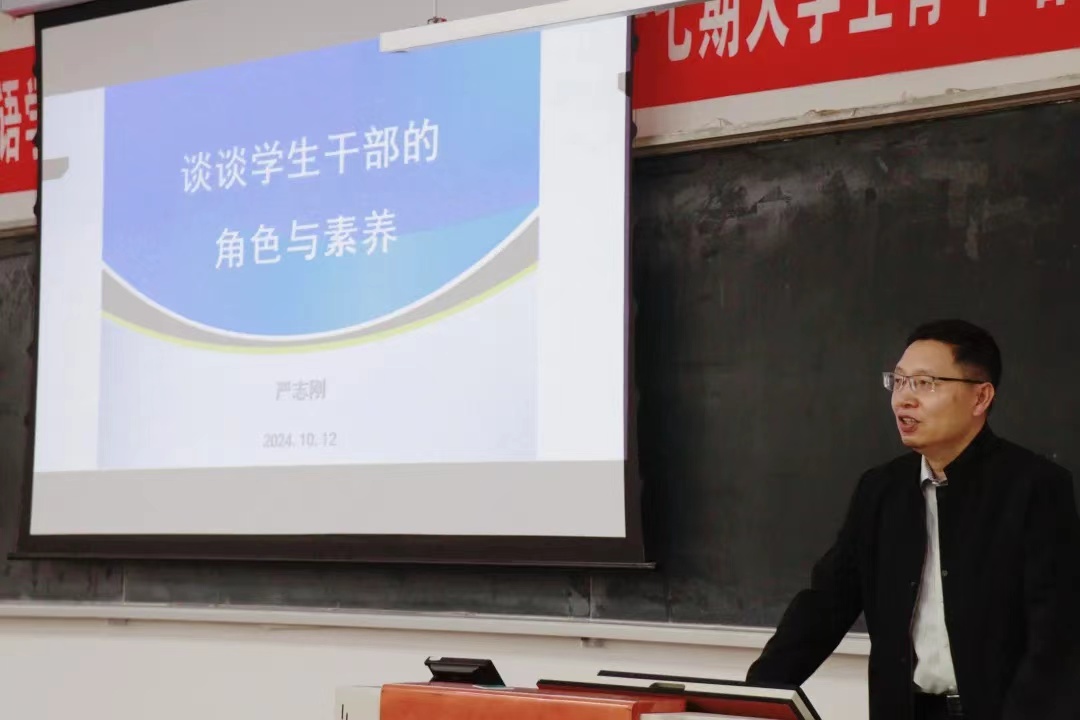 严志刚老师从国际、国内、校内角色的角度,阐述了学生干部应有的责任与素养,并对学员们做好学生干部提出了要求与期望。严志刚老师指出学生干部应该发挥好自身组织联络作用,以推进各项工作高效开展。最后,严老师用“一分耕耘,一分收获”与学员们共勉,激励学员们踏实奋进。