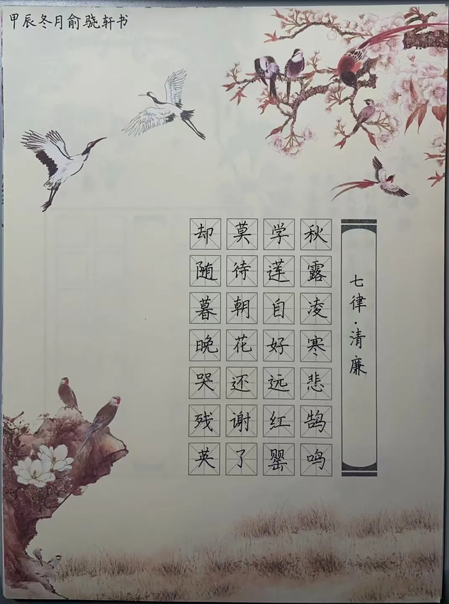 创作理念:首句描绘了莲花在清澈的水中盛开的场景,象征清正廉洁的品格;次句表达坚守初心、不被尘世污浊所染的高尚情操。通过对比强调廉洁自律的重要性,赞颂坚韧不拔的廉洁精神。本诗以莲花、竹影、梅花等意象为主题,传递廉洁自律的精神风貌,弘扬清风正气,厚植廉洁意识,为社会注入正能量。