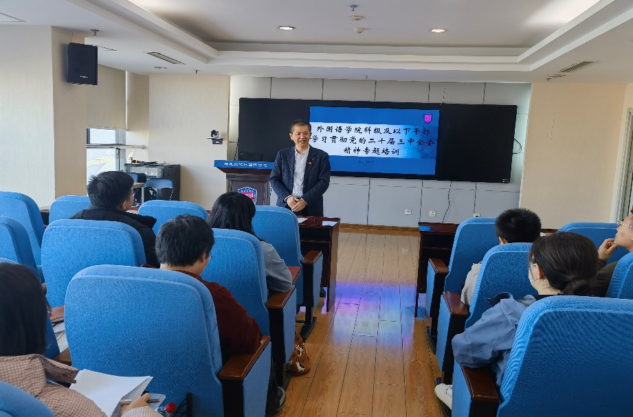 11月21日,外国语二 人 麻将 在主楼1008室举办科级以下干部学习贯彻党的二十届三中全会精神教育培训开班仪式暨第一次全体学习。二 人 麻将 机关全体人员参加培训,机关党支部书记张立夫主持开班仪式。