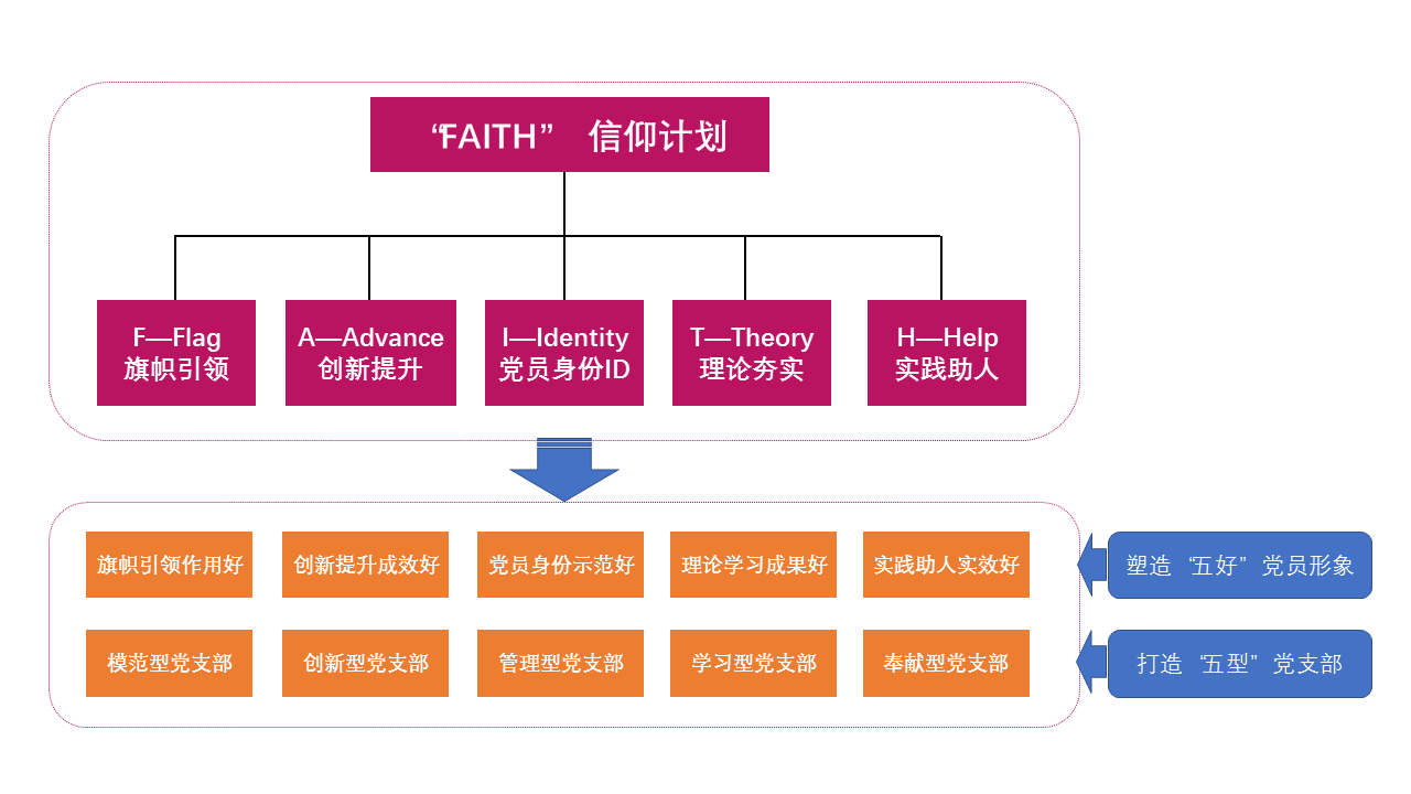 “FAITH信仰计划”不仅塑造了良好的“五好”党员形象,同时在加强党支部建设方面也起到了强有力的作用。“Flag(旗帜引领)”板块着力建设“模范型”党支部;“Advance(创新提升)”板块着力建设“创新型”党支部;“Identity(党员身份ID)”板块着力建设“管理型”党支部;“Theory(理论夯实)”板块着力建设“学习型”党支部;“Help(实践助人)”板块着力建设“奉献型”党支部。通过系统推进,全面打造立体化的“五型”党支部,使基层党支部更加有组织力、战斗力和凝聚力,广大同学对学生党组织的认可度和向往度越来越高,形成了稳健的良性循环。