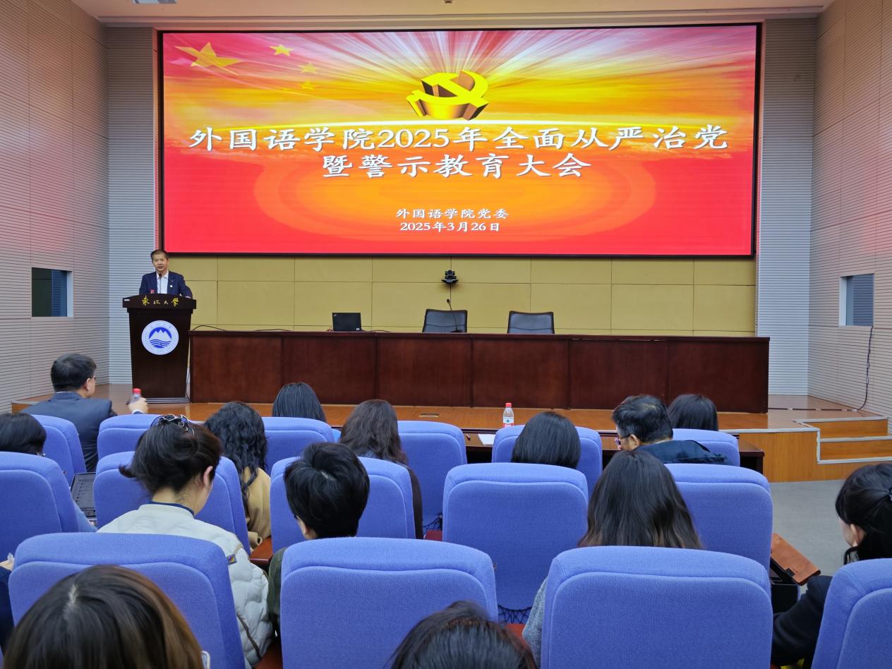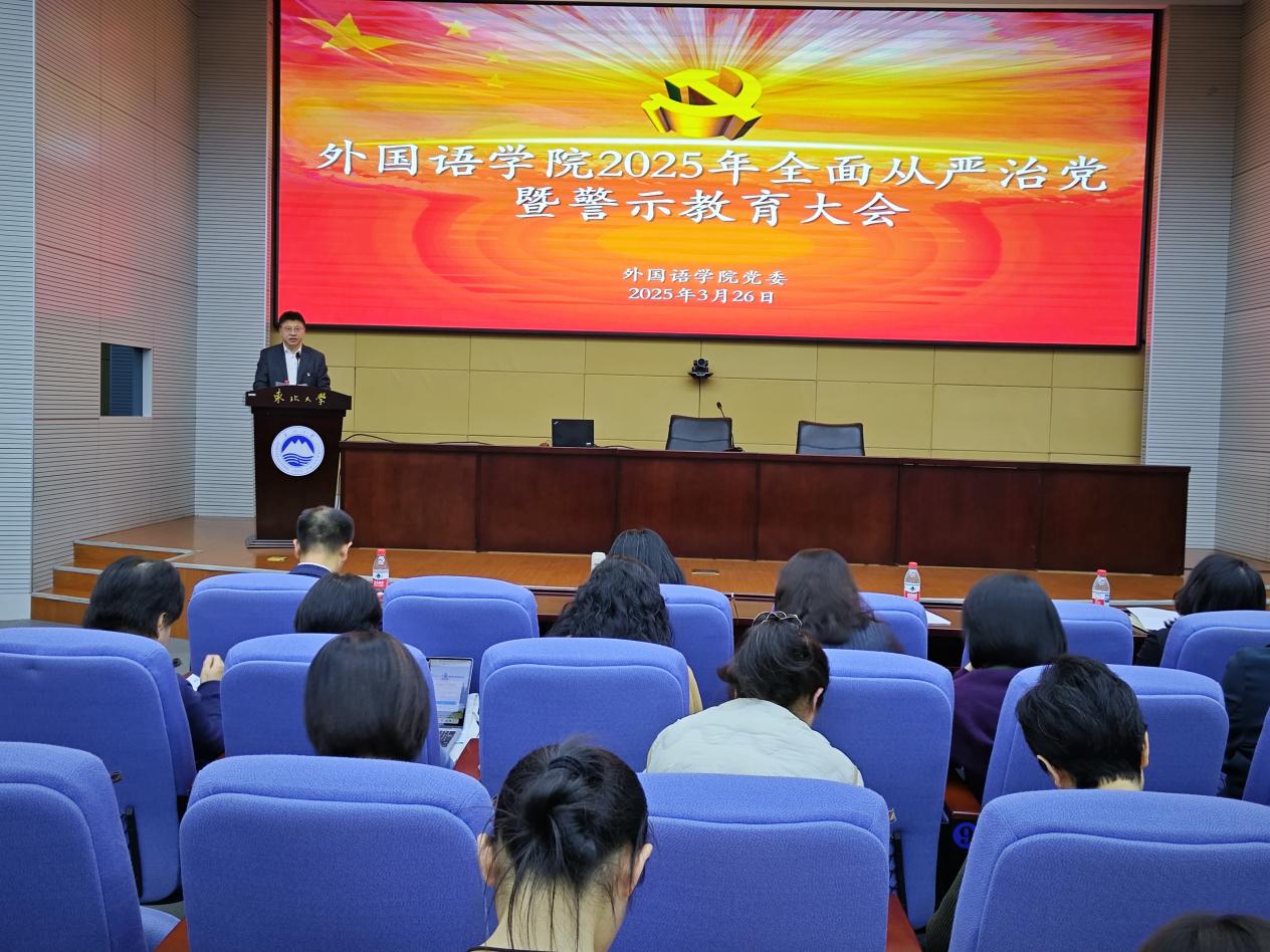 为深入贯彻落实二十届中央纪委四次全会精神,推进二 人 麻将 全面从严治党工作向纵深发展,3月26日下午,外国语二 人 麻将 党委在主楼822室召开2025年全面从严治党暨警示教育大会。会议由党委书记张满胜主持,二 人 麻将 全体教职工参加会议。