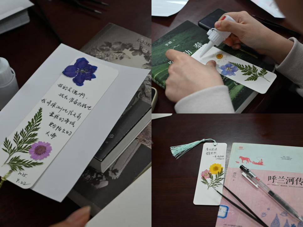 除交流分享外,活动特别设置“把春天夹进书页里”书签制作环节,同学们将经典金句誊抄在书签上,并利用干花等春日元素,亲手制作专属书签。大家纷纷表示,这种“将自然融入阅读”的形式,让书籍不仅成为知识载体,更成为留存春日记忆的文化符号。