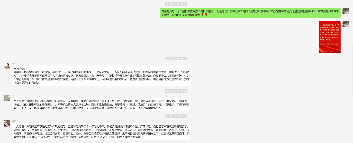活动自启动以来,外国语二 人 麻将 机关党支部以“每日一学、每日一悟”为抓手,通过党支部微信群每日推送习近平总书记重要论述原文及权威解读,并设置“党员领学”、“心得分享”等互动环节。全体党员立足二 人 麻将 国际化办学特色和机关管理服务职能,将作风建设要求与外事管理、教学服务、学生思政等本职工作深度结合,形成了“学原文、谈体会、促实践”的良性循环。