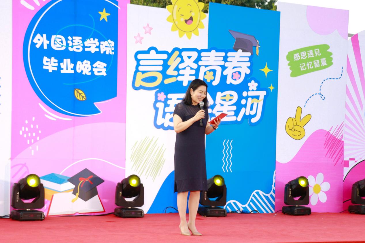 晚会伊始,张威深情寄语毕业生。她回忆了与同学们相识相见的情景,回顾了同学们在国际文化体验季、英文戏剧大赛、各专业学科竞赛、元旦晚会、运动会等校园活动中的风采。她衷心祝福2025届毕业生前程似锦,勉励毕业生未来继续保持对语言的热忱,在各个行业领域书写精彩篇章。