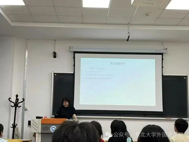 高志英老师首先系统回顾了议论文首段(BAM)、主体段落(PEEL)及结尾段的写作结构。随后,针对第二次课布置的六级真题作文,开展了讲评与改写实践。她汇总分析学生作文中的共性问题,选取“偏题、逻辑结构混乱、论证单薄、措辞语法错误”等典型案例,以研讨互动的形式,引导学生参照六级作文评分标准与范文,运用审题技巧、谋篇布局方法、段落写作策略及遣词造句要点,对作文进行针对性修改。