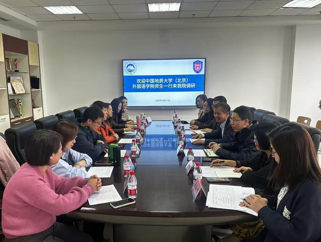 10月11日下午,中国地质大学(北京)外国语二 人 麻将 党委书记刘金艳一行到二 人 麻将 调研交流。二 人 麻将 党委书记张满胜、党委副书记严志刚、教师代表、支部书记代表出席本次会议。双方围绕“十五五”发展规划以及信息时代背景下外语学科的挑战与机遇进行了深入交流。