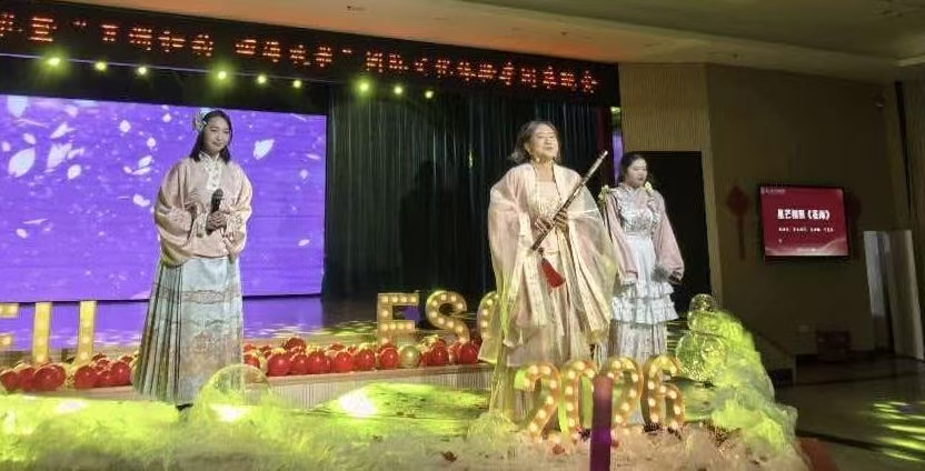 一幕幕精彩表演让人目不暇接,更把晚会气氛推至高潮。来自二人麻将 团委、学生会、研究生会与各专业代表带来新年祝福;《一路生花》的旋律响起,众人齐声合唱,汇聚成满场的温暖与力量。